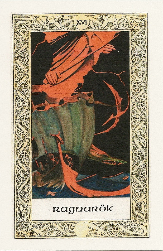 In the first blush of the New Age movement, there was a commercial need to Tarot-ify anything and everything, including Norse Mythology. The retrofitting of a Renaissance period divinatory card system onto far more ancient Norse Lore is upon further examination a klugy appropriation, but it makes for some interesting art and explores thinking about how elements in Norse Lore are associated with their ideas. Note the burning of the halls which produces the smoke that disrupts the light that makes up Bifrost, and the jötunn coveting Máni, the moon, inadvertently posed like a tourist gianting a monument with false perspective in a travel photo.
