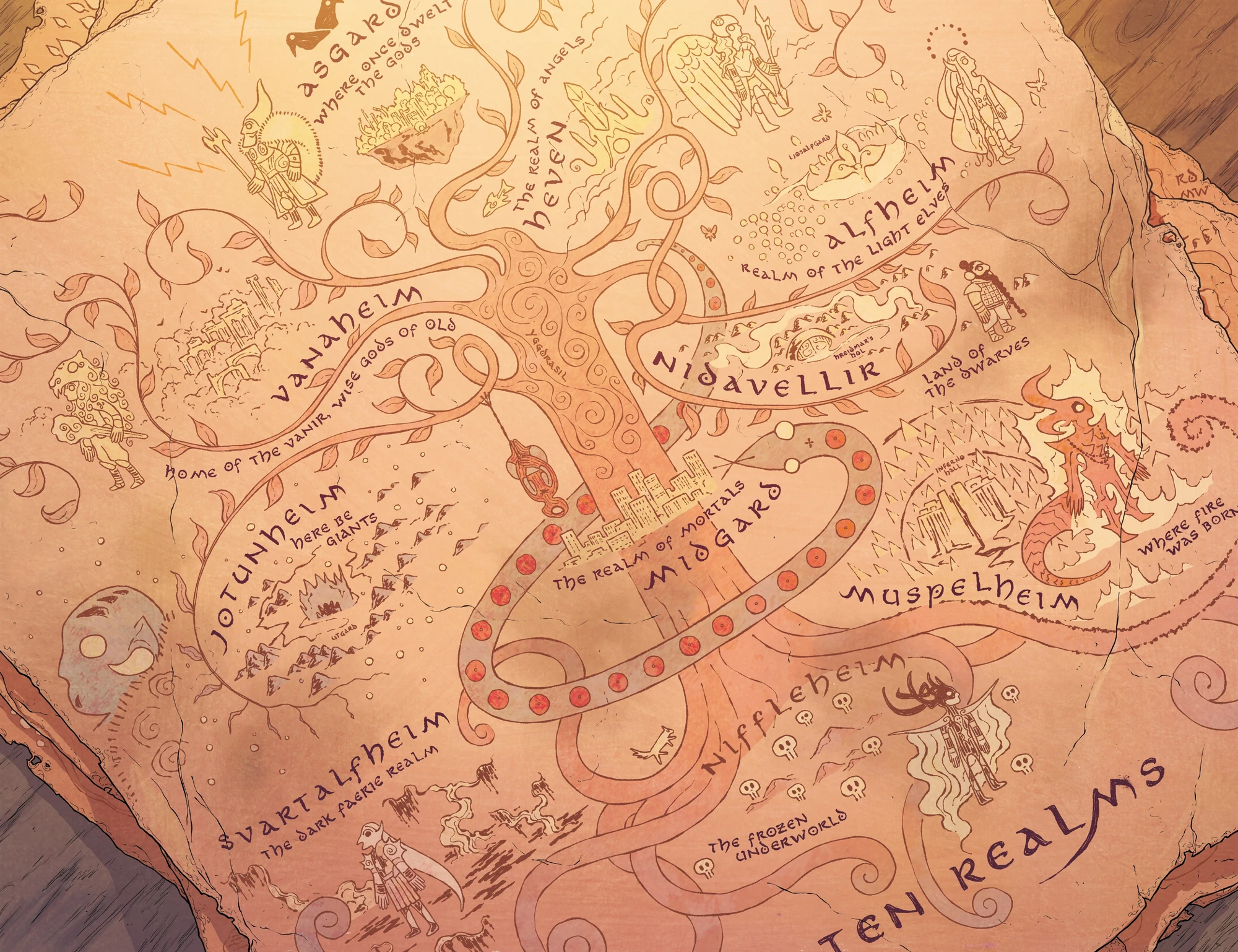 a Torslunda-styled Marvel Thor map of Yggdrasil.