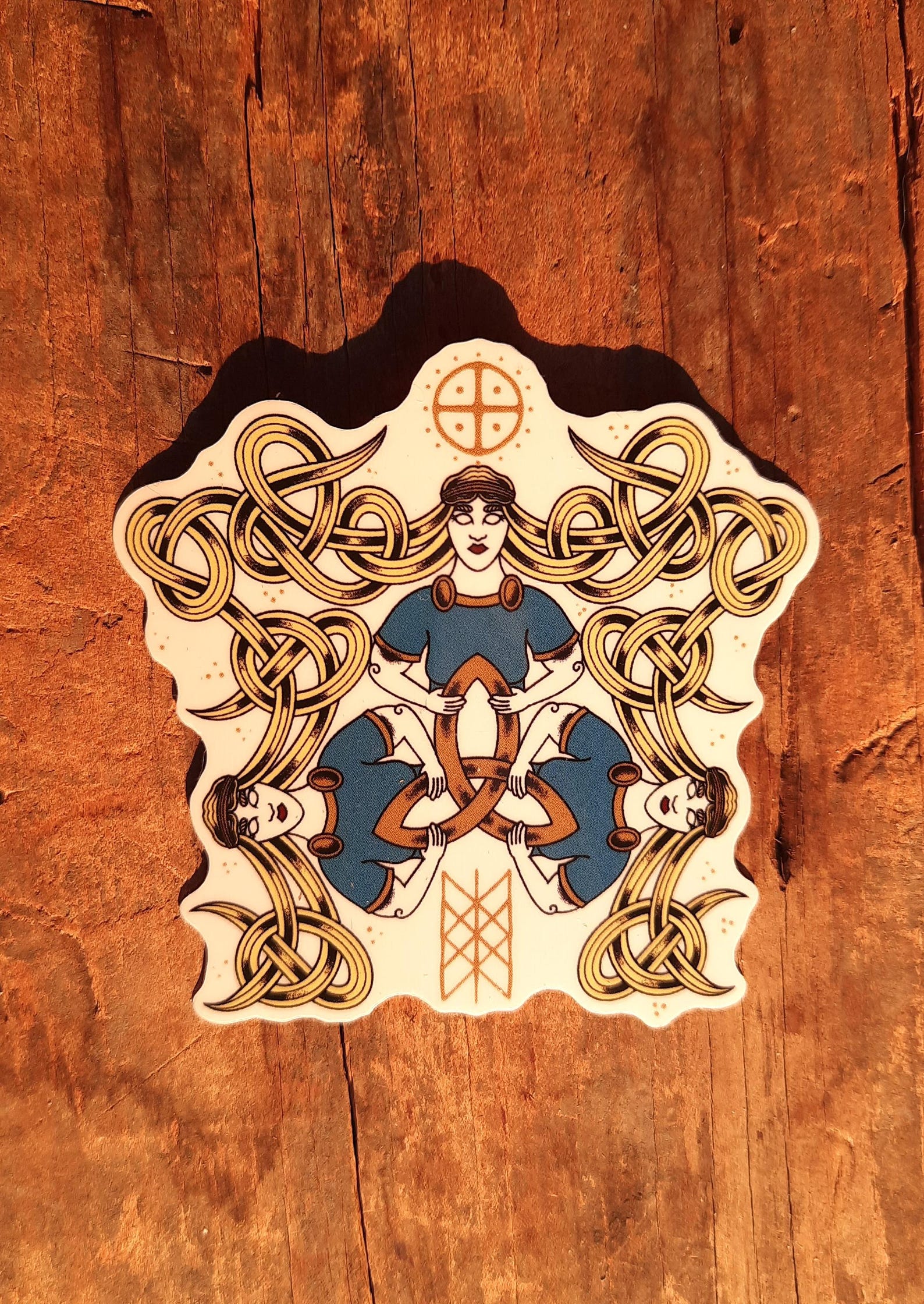 Urðr, Verdandi, & Skuld's shared knotty 'do reflects how temporally interwoven The Norns are, for the past, present, and future cords they attend are all along the same thread, which here has its origin from that triquetra skein they're all manipulating at once. The Web Of Wyrd all-Futhark inclusive bindrune sits beneath them, possibly positioned where it reveals itself to Odin after his self-sacrificial ordeal. Now you can place those Fates around your own personal Well Of Waterbottle to keep Yggself hydrated.