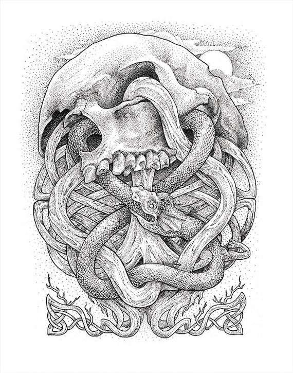 | [Ymir's Skull, stippling pen & ink by Jason Kreiger. Purchase prints here.] |